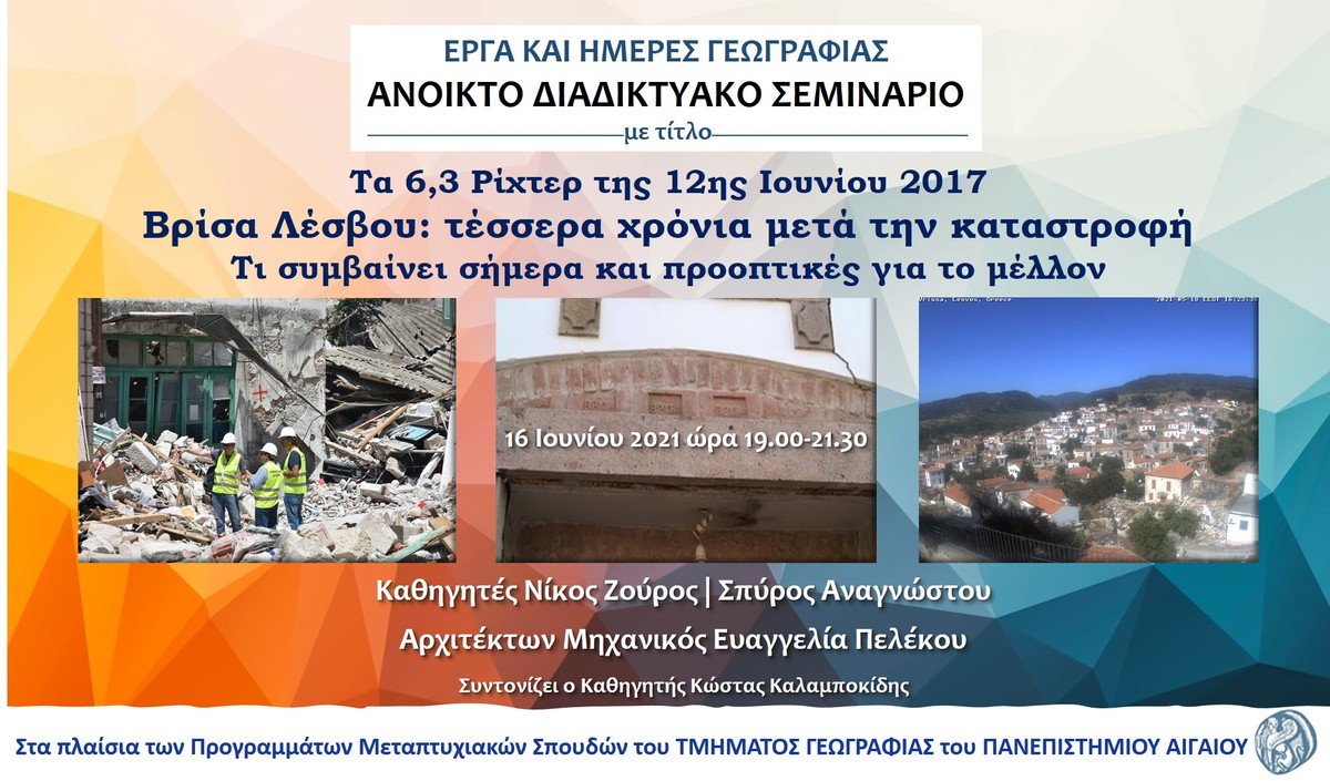 Στα πλαίσια των Προγραμμάτων Μεταπτυχιακών Σπουδών του Τμήματος Γεωγραφίας του Πανεπιστημίου Αιγαίου Θα δοθεί την Τετάρτη 16 Ιουνίου 2021 (ώρα 7:00 μ.μ.) ανοικτό διαδικτυακό σεμινάριο με τίτλο: